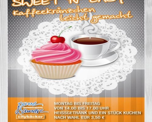 Für ein gelungenes Kaffeekränzen empfehlen wir das “Sweet n Easy” Angebot. Dabei kann man dann Kaffee und ein Stück Kuchen (freie Wahl) für EUR 3,50 genießen. Und das immer montags bis freitags von 14.00 bis 17.00 Uhr.